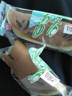 説明しよう! 『あゆ若』(正式名は知らない)は、鮎をモチーフにしたどら焼きの生地の中に餅をサンドした画期的な和菓子なのだ!!
